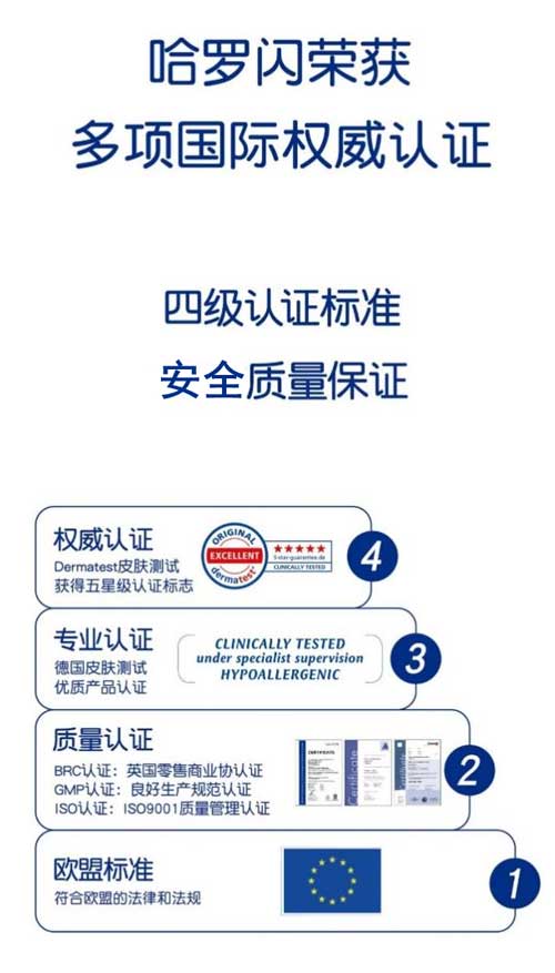 獲得Dermatest認(rèn)證,意味著哈羅閃產(chǎn)品從源頭把控,研發(fā)生產(chǎn)出對(duì)寶寶皮膚溫和無(wú)刺激,給予寶寶皮膚更為嚴(yán)謹(jǐn)、安全的呵護(hù)。