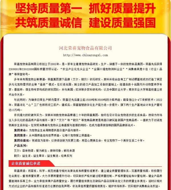 榮喜寵物食品有限公司創(chuàng)立于2002年,是一家專注健康寵物食品研發(fā)、生產(chǎn)、銷售于一體的寵物食品集團。自創(chuàng)立以來,一直堅持以寵物全生命周期提供高價值產(chǎn)品與服務為使命。