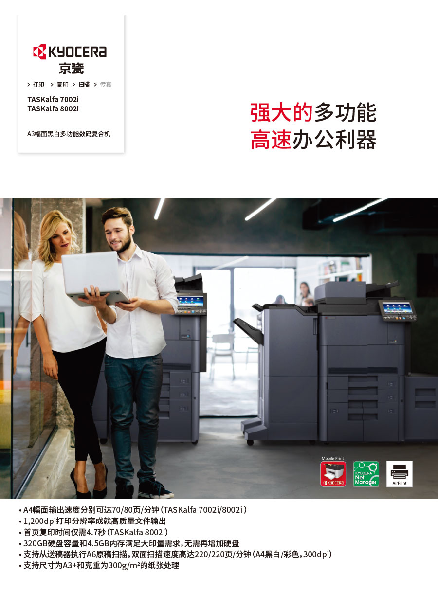 主要產(chǎn)品:KYOCERA京瓷激光打印機(jī),一體機(jī),復(fù)合機(jī),生產(chǎn)型彩色噴墨數(shù)碼印刷系統(tǒng)及辦公信息系統(tǒng)的開發(fā)、設(shè)計(jì)、系統(tǒng)集成
