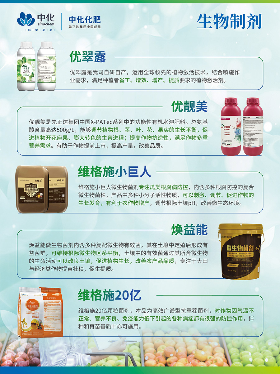 美麟美、麟葆等生物磷肥由中化化肥與中國(guó)農(nóng)業(yè)科學(xué)院聯(lián)合研發(fā),中化化肥獨(dú)家經(jīng)營(yíng),目前已升級(jí)為第三代產(chǎn)品,其“信號(hào)誘導(dǎo)促根”科技為全球獨(dú)創(chuàng),榮獲“中國(guó)增效肥料優(yōu)秀品牌“稱號(hào)藍(lán)麟是中化化肥聯(lián)合先正達(dá)研制的致力于高端經(jīng)作提質(zhì)抗逆的全水溶功能復(fù)合肥,是具有全水溶、速效性、長(zhǎng)效性、增效性的尖端科技產(chǎn)品。