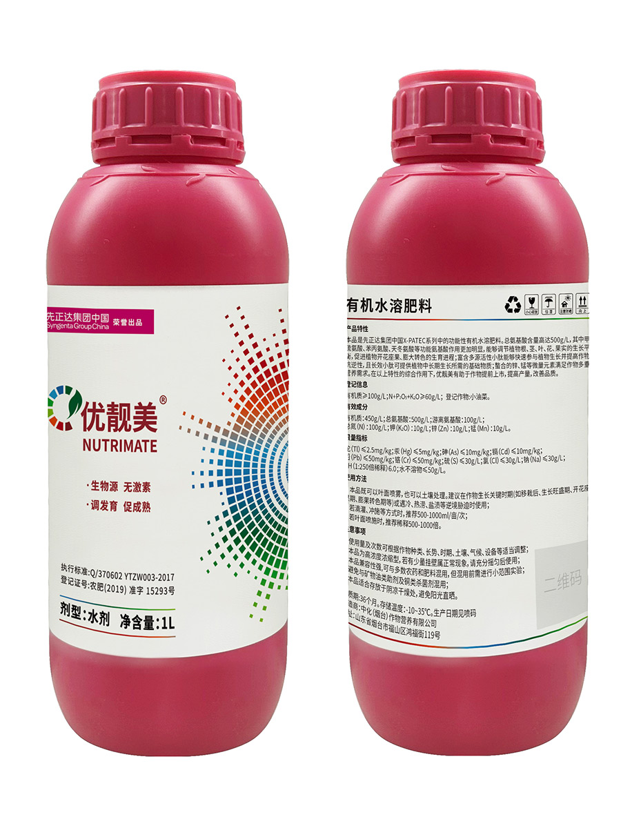 優(yōu)靚美是先正達(dá)集團(tuán)中國(guó)X-PATec系列中的功能性有機(jī)水溶肥料??偘被岷扛哌_(dá)500g/L,能夠調(diào)節(jié)植物根、莖、葉、花、果實(shí)的生長(zhǎng)平衡,促進(jìn)植物開(kāi)花座果、膨大轉(zhuǎn)色的生育進(jìn)程;提高作物抗逆性,滿足作物多重營(yíng)養(yǎng)需求。有助于作物提前上市,提高產(chǎn)量,改善品質(zhì)。
