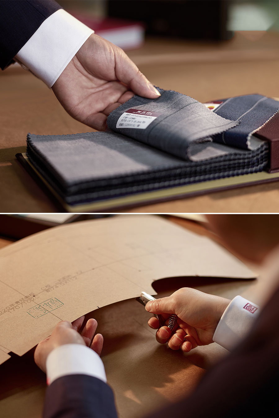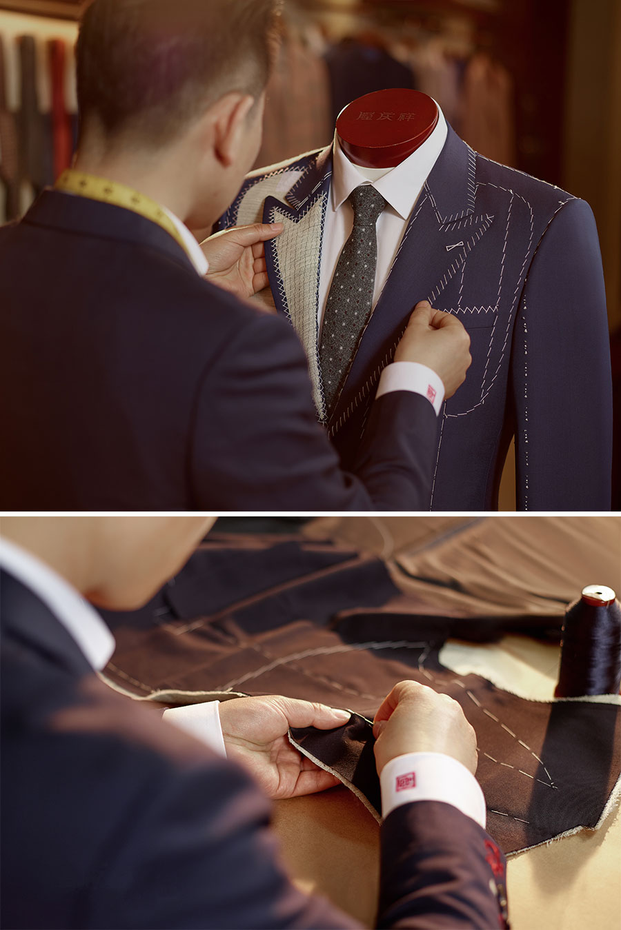 隆慶祥以量身定制為核心特色,提供從面料選擇、款式設(shè)計(jì)到工藝優(yōu)化、售后服務(wù)的全程服務(wù),產(chǎn)品均為“單人單版、單版單裁、單裁單做”,以獨(dú)一無二的專屬性彰顯尊貴榮耀。每套西裝定面料、定款式、制版、裁剪、制作、試樣、后道整理、取件共八道工序,均采用406道工序,而且大量工序是手工制作。產(chǎn)品均“單人單版、單版單裁、單裁單做”,以獨(dú)一無二的專屬性彰顯尊貴榮耀。