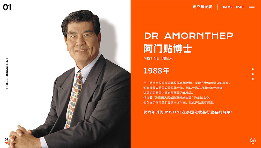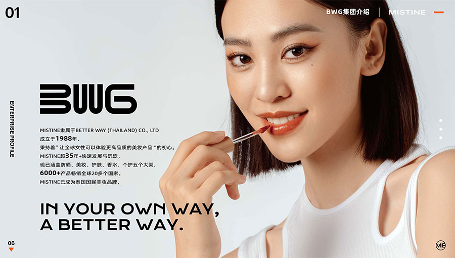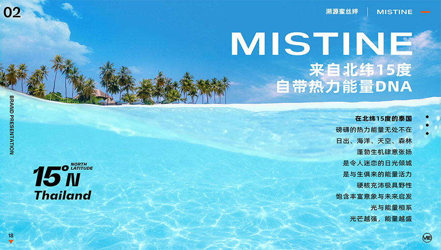 MISTINE蜜絲婷1988年始源于泰國,作為知名國際美妝品牌,擁有超過35年的科研底蘊(yùn),產(chǎn)品種類涵蓋防曬、美妝、護(hù)膚、香水、個(gè)護(hù)五大類,擁有近6000多個(gè)單品暢銷全球20多個(gè)國家,專注為全球女性提供豐富、安全、高品質(zhì)的美妝產(chǎn)品。自2016年進(jìn)入中國后,MISTINE蜜絲婷以“熱帶青春能量美妝”為品牌定位,為年輕人打造更懂得他們的全新美妝產(chǎn)品,并傳遞獨(dú)特的健康活力生活方式。