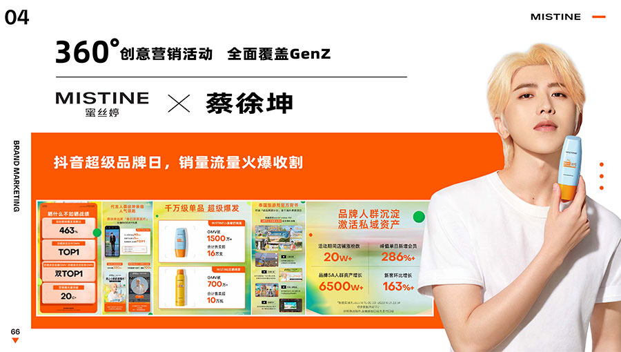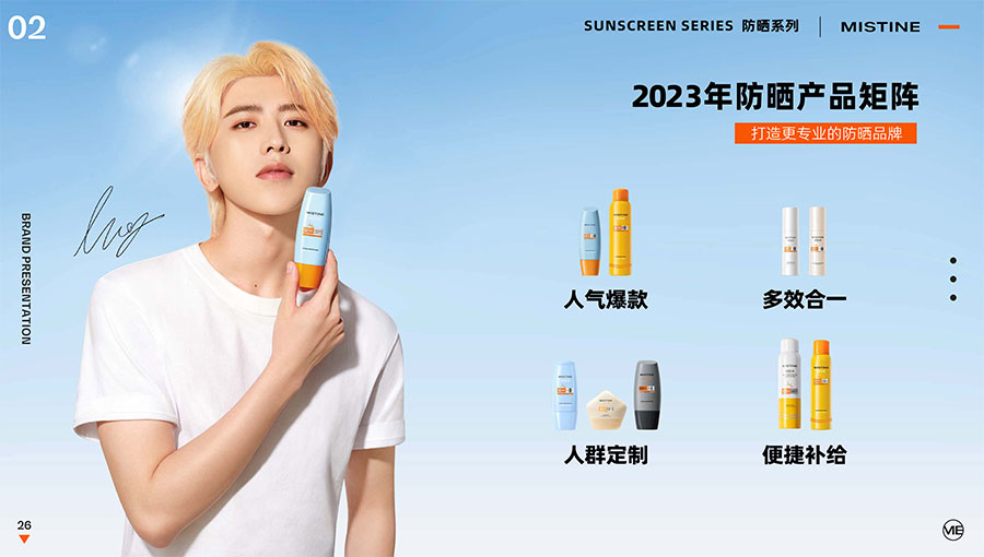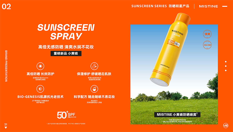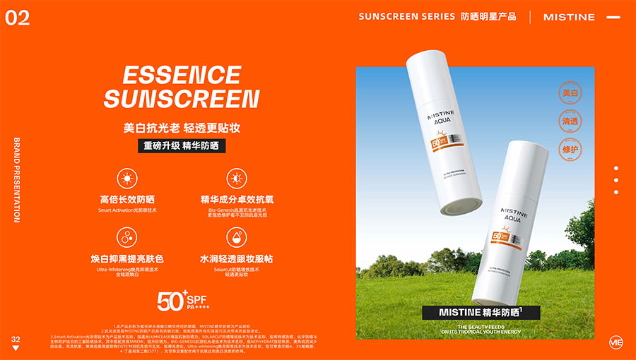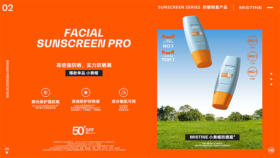 MISTINE蜜絲婷提出皮膚科學(xué)、前沿科技、靈魂成分、熱帶美學(xué)、卓越功效、保護(hù)環(huán)境六大品牌價(jià)值,致力于為全球女性提供豐富、安全、高品質(zhì)的美妝產(chǎn)品?;贛ISTINE蜜絲婷品牌首席科學(xué)顧問——全球計(jì)算生物學(xué)權(quán)威之一、諾貝爾化學(xué)獎(jiǎng)得主Arieh Warshel的研究,MISTINE蜜絲婷創(chuàng)新防曬品類推出「光生物學(xué)」防曬系統(tǒng),提出“外層防護(hù)、中層修護(hù)和底層抗損”防曬新理念,引領(lǐng)防曬從“表面防護(hù)”進(jìn)入“深度抗光老”新時(shí)代。同時(shí),MISTINE蜜絲婷還持續(xù)深耕專業(yè)彩妝市場,以熱帶美學(xué)基因造就產(chǎn)品防水防汗、高倍耐曬、長效持妝的優(yōu)勢,圍繞消費(fèi)者需求打造多元化的產(chǎn)品矩陣,引領(lǐng)防曬、底妝賽道發(fā)展。