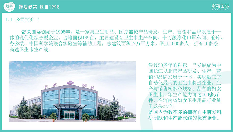 河南舒萊衛(wèi)生用品有限公司成立于1998年,位于許昌市襄城縣產(chǎn)業(yè)集聚區(qū),是一家集自主研發(fā)、生產(chǎn)、銷售及服務(wù)于一體的中原地區(qū)及周邊省份最大的婦女衛(wèi)生巾和婦女衛(wèi)生護(hù)墊的專業(yè)生產(chǎn)企業(yè)。