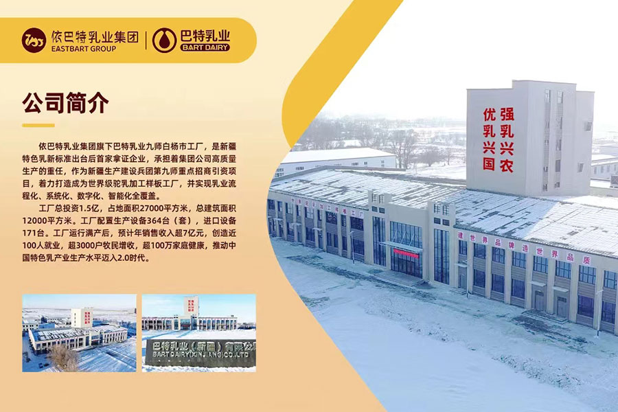 巴特乳業(yè)是依巴特乳業(yè)集團(tuán)核心業(yè)務(wù)板塊之一,作為新標(biāo)駝乳引領(lǐng)者,承擔(dān)高質(zhì)量生產(chǎn)重任,工廠位于新疆兵團(tuán)第九師白楊市,總建筑面積近7000平方米,配置生產(chǎn)設(shè)備364臺(套),其中進(jìn)口設(shè)備171臺。擁有萬畝天然牧場,充分實現(xiàn)奶源自控,已連續(xù)多年獲得國家有機認(rèn)證。目前已發(fā)展成為一家集養(yǎng)殖、研發(fā)、生產(chǎn)、OEM、銷售為一體的乳制品科學(xué)配方創(chuàng)新技術(shù)優(yōu)秀企業(yè),乳制品行業(yè)具有影響力企業(yè),鄉(xiāng)村振興標(biāo)桿企業(yè)。