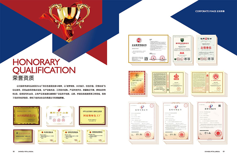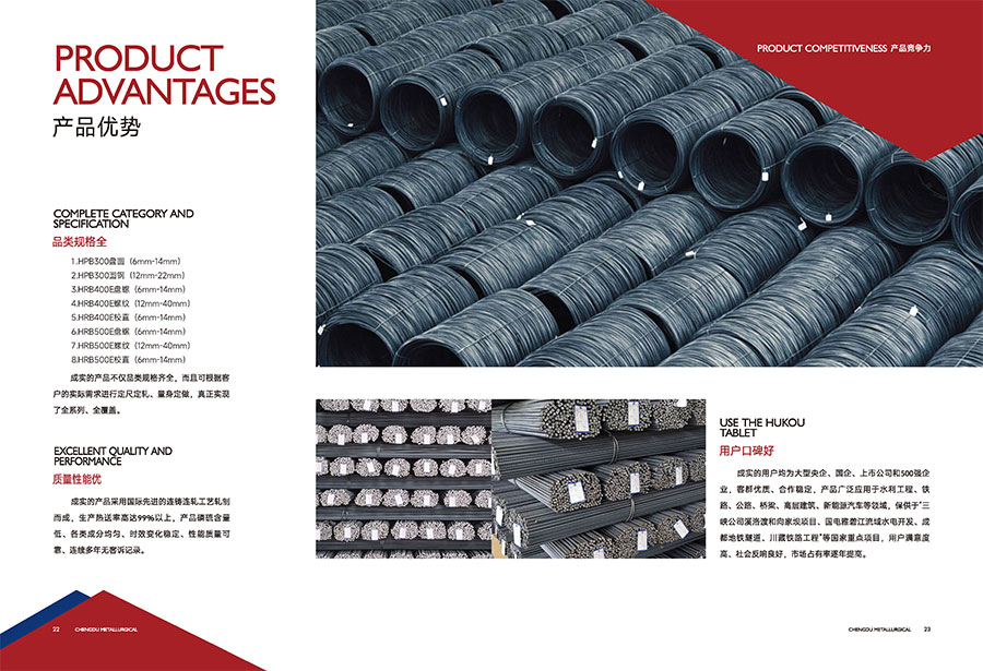 公司始終奉行“質(zhì)量第一、客戶至上”的經(jīng)營理念,在產(chǎn)品質(zhì)量上精益求精,先后獲得“全國冶金產(chǎn)品實物金杯獎”,“全國用戶滿意產(chǎn)品”、“四川造·全國知名產(chǎn)品”、“四川省名牌”等榮譽,連續(xù)多年躋身四川省民營企業(yè)100強、成都企業(yè)100強、成都制造業(yè)企業(yè)前50強、成都民營企業(yè)前30強。公司在細(xì)分市場上精耕細(xì)作,主要綠色產(chǎn)品有含釩高強度抗震鋼筋、工業(yè)用鋼、冷鐓鋼等,廣泛應(yīng)用于水利工程、新能源汽車等領(lǐng)域,保供于三峽公司溪洛渡和向家壩項目、國電雅礱江流域水電開發(fā)、華能瀘定縣大渡河水電開發(fā)、成都地鐵隧道、川藏鐵路工程等國家重點項目,產(chǎn)品巿場占有率逐年增長。
