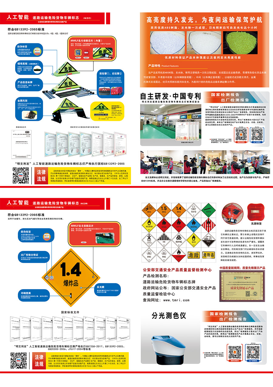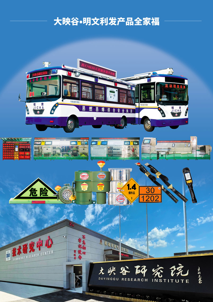 主要產(chǎn)品:北斗安防人工智管系統(tǒng),火災(zāi)爆炸危險(xiǎn)場所移動(dòng)稽查車,危險(xiǎn)品運(yùn)輸安全隱患移動(dòng)檢測車,危險(xiǎn)品運(yùn)輸車輛安防裝備租售檢測亭,不產(chǎn)生火花人工智能汽車導(dǎo)靜電橡膠拖地帶,人工智能機(jī)動(dòng)車排氣火花熄滅器,人工智能道路運(yùn)輸危險(xiǎn)貨物車輛標(biāo)志燈、標(biāo)志牌
