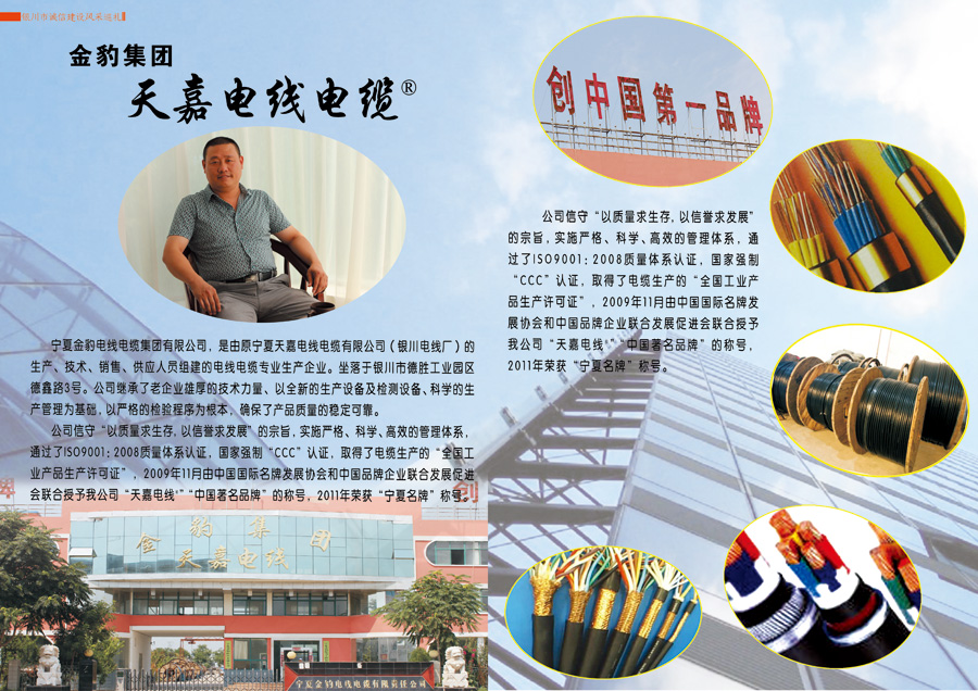 公司信守“以質量求生存,以信譽求發(fā)展”的宗旨,實施嚴格、科學、高效的管理體系,通過了ISO9001:2008質量體系認證,國家強制“CCC”認證,取得了電纜生產的“全國工業(yè)產品生產許可證”,2009年由中國國際名牌發(fā)展協(xié)會和中國品牌企業(yè)聯(lián)合發(fā)展促進會聯(lián)合授予公司“天嘉電線®”“中國著名品牌”的稱號,2011年榮獲“寧夏名牌”稱號。公司是寧夏質量管理協(xié)會副會長單位、銀川市質量管理協(xié)會理事單位、賀蘭縣質量管理協(xié)會理事單位、中國電器工業(yè)協(xié)會電線電纜分會會員單位。