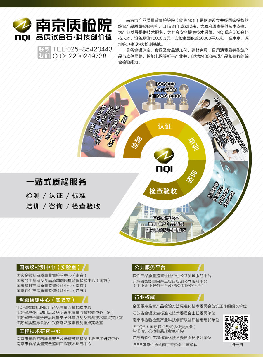 南京市產(chǎn)品質(zhì)量監(jiān)督檢驗(yàn)院(南京市質(zhì)量發(fā)展與先進(jìn)技術(shù)應(yīng)用研究院),簡(jiǎn)稱“南京質(zhì)檢院”“NQI”,成立于1983年,在全國(guó)市場(chǎng)監(jiān)管系統(tǒng)綜合性檢測(cè)認(rèn)證機(jī)構(gòu)中實(shí)力領(lǐng)先,是全國(guó)市級(jí)質(zhì)檢機(jī)構(gòu)中唯一的科研院所。
