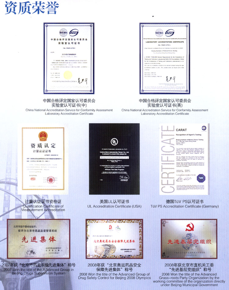 北京市醫(yī)療器械檢驗所(國家食品藥品監(jiān)督管理局北京醫(yī)療器械質量監(jiān)督檢驗中心,以下簡稱“北檢所”)是中國合格評定國家認可委員會(CNAS)、中國國家認證認可監(jiān)督管理委員會(CNCA)、國家食品藥品監(jiān)督管理局(SFDA)等部門認可授權的一所綜合性醫(yī)療器械產(chǎn)品檢測機構。經(jīng)CNAS授權的檢驗范圍涵蓋醫(yī)用電子、醫(yī)用射線、核醫(yī)學、電聲學、體外診斷系統(tǒng)、一次性醫(yī)療產(chǎn)品、醫(yī)用防護用品、醫(yī)用橡膠制品、口腔材料、生物安全柜、電磁兼容、生物相容性等專業(yè)領域,檢驗項目涉及472項;經(jīng)SFDA授權檢測項目達599項,承擔著授權范圍內醫(yī)療器械產(chǎn)品監(jiān)督抽驗檢驗、注冊檢驗、認證檢驗、進出口商品檢驗、科技成果鑒定檢驗以及委托檢驗、仲裁檢驗等檢測任務;2002年,成為中國質量認證中心(CQC)簽約實驗室,承擔醫(yī)用X射線診斷設備、心電圖機、血液透析裝置和橡膠避孕套的強制性產(chǎn)品安全認證檢測任務。此外,該所先后獲得TüV PS、UL等國際權威認證機構的認可,是目前國內開展檢驗業(yè)務專業(yè)最全面的醫(yī)療器械檢驗機構。