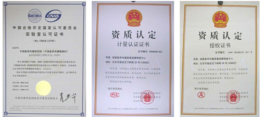 國(guó)家家用電器質(zhì)量監(jiān)督檢驗(yàn)中心(中國(guó)家用電器檢測(cè)所)是我國(guó)最早獲得依據(jù)國(guó)際實(shí)驗(yàn)室管理標(biāo)準(zhǔn)認(rèn)可的實(shí)驗(yàn)室之一;是中國(guó)國(guó)家認(rèn)證認(rèn)可監(jiān)督管理委員會(huì)指定的強(qiáng)制性產(chǎn)品認(rèn)證檢測(cè)機(jī)構(gòu);是中國(guó)質(zhì)量認(rèn)證中心、中國(guó)環(huán)境標(biāo)志認(rèn)證中心、中國(guó)方圓標(biāo)志認(rèn)證中心、北京中輕聯(lián)認(rèn)證中心、中國(guó)消費(fèi)者協(xié)會(huì)、北京市消費(fèi)者協(xié)會(huì)的簽約實(shí)驗(yàn)室;獲香港機(jī)電署EMSD認(rèn)可核證團(tuán)體資格。