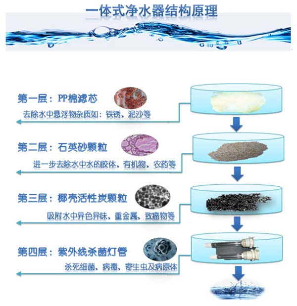鄧凈公司主打產(chǎn)品,鄧凈牌凈水機(jī)YCZ-QT8-DJ01。鄧凈凈水機(jī)YCZ-QT8-DJ01以生物慢濾為原型,采用純物理凈化原理和漸進(jìn)式結(jié)構(gòu)即纖維素濾芯+石英石+活性炭+紫外線消毒四級過濾,通過截留、沉降、吸附和殺菌等作用,有效地凈化水源,改善飲用水安全。