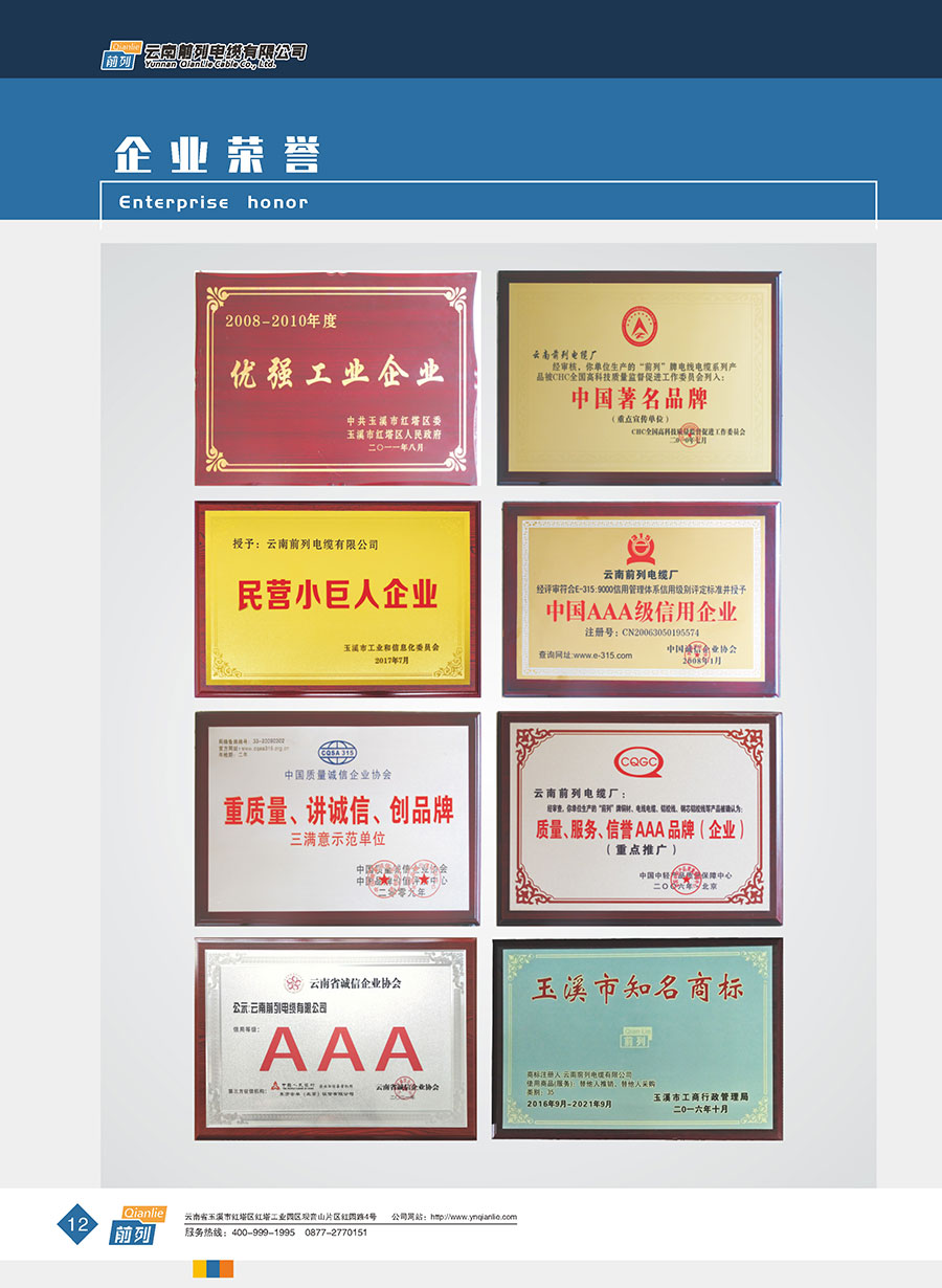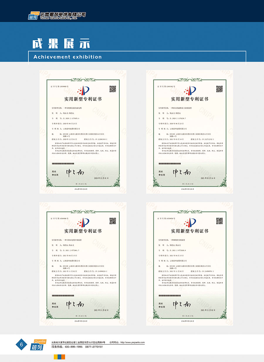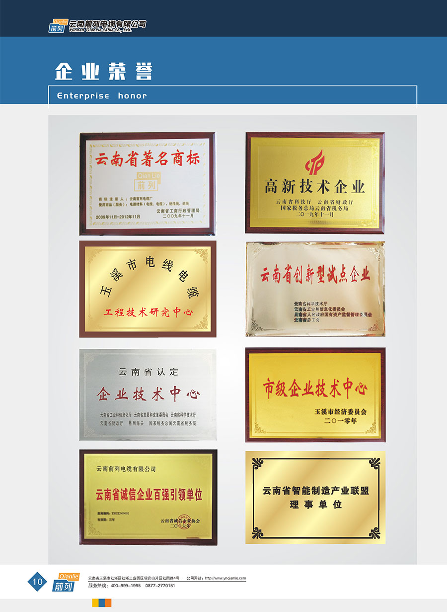 企業(yè)管理先進(jìn),設(shè)施完善,全部產(chǎn)品取得全國(guó)工業(yè)產(chǎn)品生產(chǎn)許可證證書,電線取得了中國(guó)強(qiáng)制性產(chǎn)品CCC認(rèn)證,同時(shí)取得了中國(guó)質(zhì)量認(rèn)證中心CQC產(chǎn)品自愿認(rèn)證、RoSH產(chǎn)品認(rèn)證。前列電纜通過了質(zhì)量管理體系認(rèn)證、環(huán)境管理體系認(rèn)證、職業(yè)健康安全管理體系認(rèn)證、能源管理體系認(rèn)證、兩化融合管理體系認(rèn)證、五星級(jí)售后服務(wù)管理體系認(rèn)證,產(chǎn)品抽檢合格率達(dá)100%。公司于2007年成立了企業(yè)技術(shù)中心,并于2010年被認(rèn)定為市級(jí)企業(yè)技術(shù)中心,同年被認(rèn)定為高新技術(shù)企業(yè),2014年被認(rèn)定為云南省創(chuàng)新型試點(diǎn)企業(yè),2015年被認(rèn)定為玉溪市電線電纜工程技術(shù)研究中心,2020年被認(rèn)定為云南省企業(yè)技術(shù)中心,2020年前列電纜“基于工業(yè)互聯(lián)網(wǎng)的電線電纜智能制造新模式應(yīng)用項(xiàng)目”被列為云南省工業(yè)互聯(lián)網(wǎng)試點(diǎn)示范項(xiàng)目,2021年被認(rèn)定為云南省專精特新小巨人企業(yè),2021年云南省工業(yè)互聯(lián)網(wǎng)“三化”改造試點(diǎn)示范項(xiàng)目,2022年被認(rèn)定為云南省綠色工廠、云南省工業(yè)產(chǎn)品質(zhì)量標(biāo)桿企業(yè)、云南省知識(shí)產(chǎn)權(quán)優(yōu)勢(shì)企業(yè)。“前列”牌電線電纜是云南名牌、云南省著名商標(biāo)、玉溪市民營(yíng)企業(yè)公益之星,多次獲得新產(chǎn)品、新技術(shù)金獎(jiǎng)、消費(fèi)者信得過產(chǎn)品、質(zhì)量服務(wù)3A企業(yè)等榮譽(yù)稱號(hào)。公司在2022年中國(guó)創(chuàng)新方法大賽全國(guó)總決賽當(dāng)中取得云南賽區(qū)一等獎(jiǎng),全國(guó)一等獎(jiǎng)。