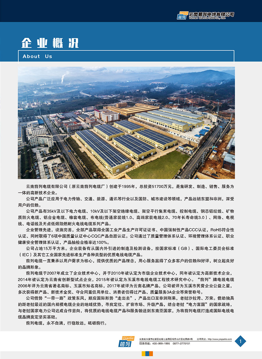 云南前列電纜有限公司(原云南前列電纜廠)創(chuàng)建于1995年,注冊(cè)資金21000萬元,是集研發(fā)、制造、銷售、服務(wù)為一體的高新技術(shù)企業(yè)。公司產(chǎn)品廣泛應(yīng)用于電力傳輸、交通、能源、通信等行業(yè)以及國(guó)防、城市建設(shè)等領(lǐng)域,產(chǎn)品遠(yuǎn)銷東盟和非洲,深受用戶的信賴。