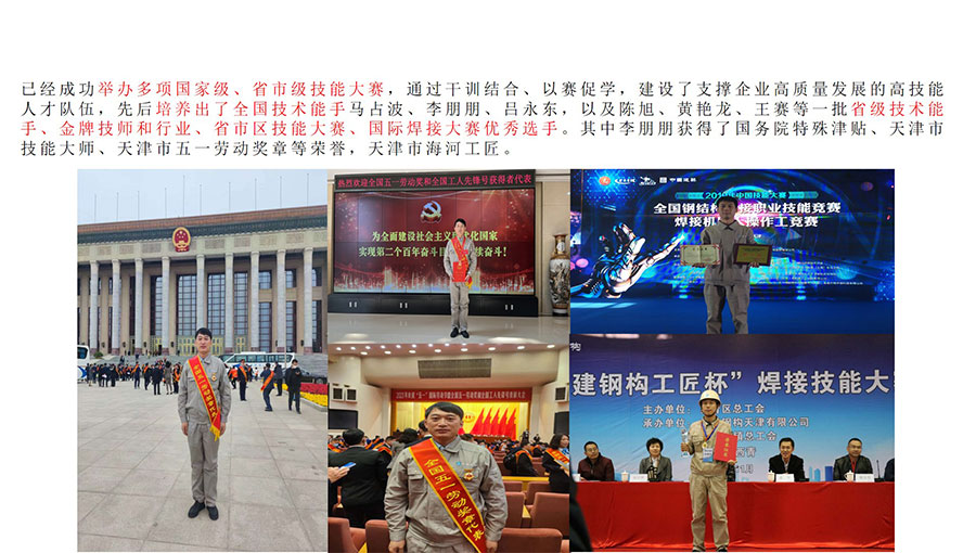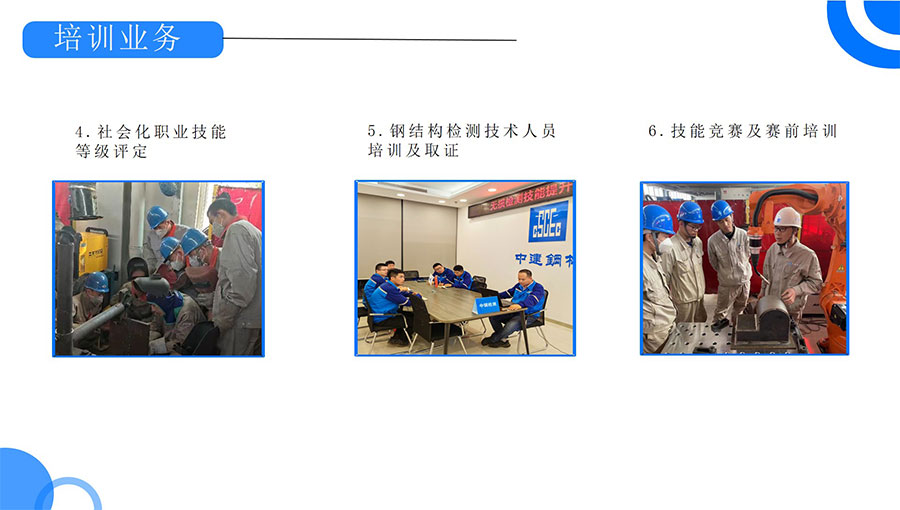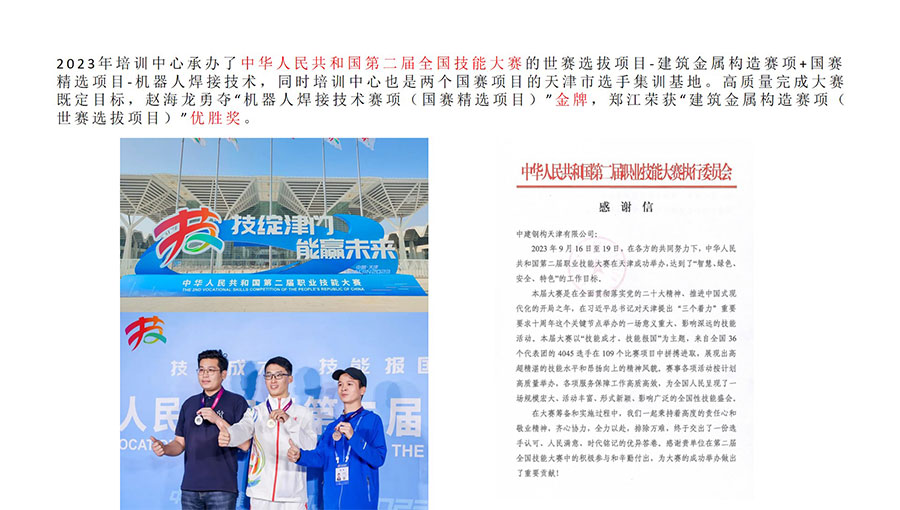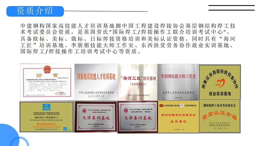 中建鋼構國家高技能人才培訓基地擁有中國工程建設焊接協(xié)會基層鋼結構焊工技術考試委員會資質,是英國勞氏“國際焊工/焊接操作工聯(lián)合培訓考試中心”,具備歐標、美標、俄標、日標焊接資格培訓和美標認證資格。同時具有“海河工匠”培訓基地、李朋朋技能大師工作室、東西扶貧勞務協(xié)作就業(yè)實訓基地、國際焊工/焊接操作工培訓考試中心等資質。