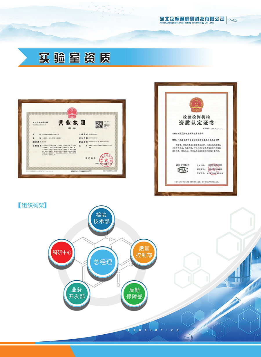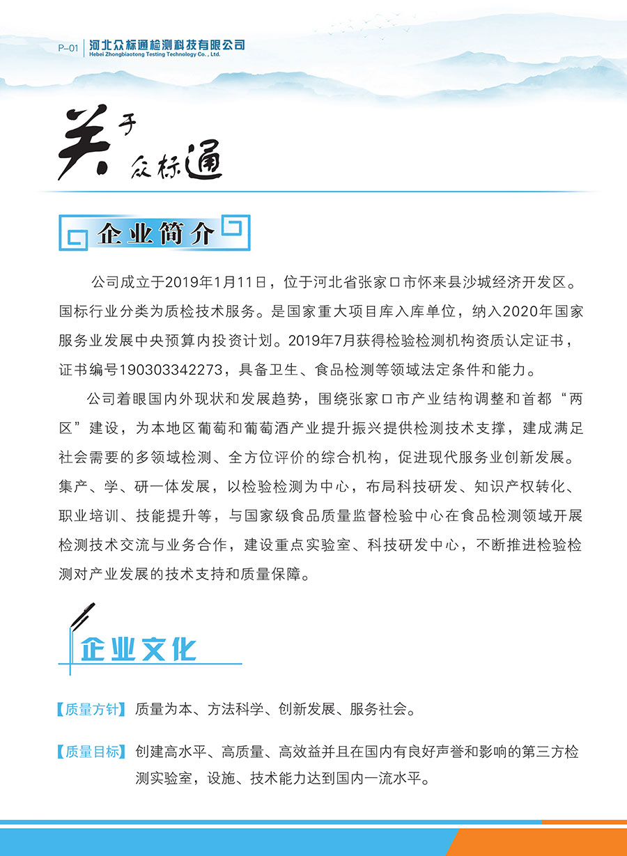 河北眾標(biāo)通檢測科技有限公司成立于2019年1月11日,位于河北省張家口市懷來縣沙城經(jīng)濟(jì)開發(fā)區(qū)。國標(biāo)行業(yè)分類為質(zhì)檢技術(shù)服務(wù)。是國家重大項(xiàng)目庫入庫單位,納入2020年國家服務(wù)業(yè)發(fā)展中央預(yù)算內(nèi)投資計(jì)劃。2019年7月獲得檢驗(yàn)檢測機(jī)構(gòu)資質(zhì)認(rèn)定證書,證書編號190303342273,具備衛(wèi)生、食品檢測等領(lǐng)域法定條件和能力。