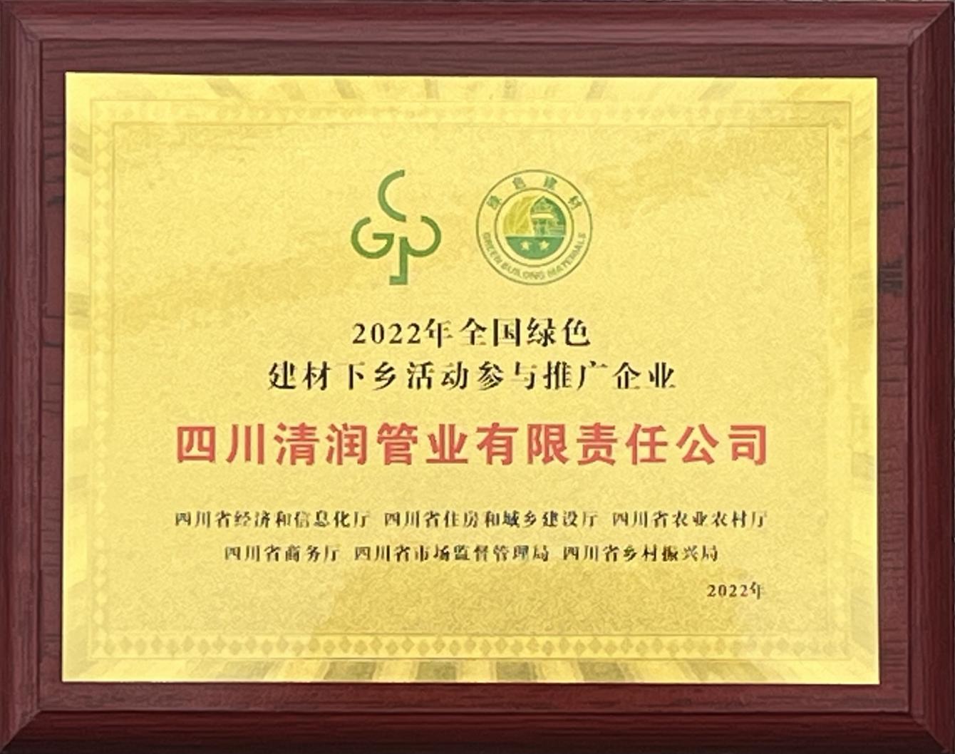 “清潤”自成立以來,便以“打造安全的城市地下生命線”為己任,先后為農飲工程、四川大學、西南民族大學、第31屆世界大學生夏季運動會場館等項目供應了一系列的優(yōu)質給水管材管件產品,得到了市場廣大客戶和社會各界的一致肯定。公司先后獲得了“四川名牌”、成都市市級守合同重信用企業(yè)稱號,入選《全國農村飲水安全工程材料設備產品信息年報》、《成都市地方產品配套目錄》,信用等級AA級,成為中國塑料加工工業(yè)協會塑料管道專業(yè)委員會理事單位、中國工業(yè)防腐蝕技術協會、四川燃氣協會等協會會員單位。2022年,在全國綠色建材產品四川站啟動會上,四川清潤管業(yè)還作為優(yōu)秀代表企業(yè)獲得授牌。