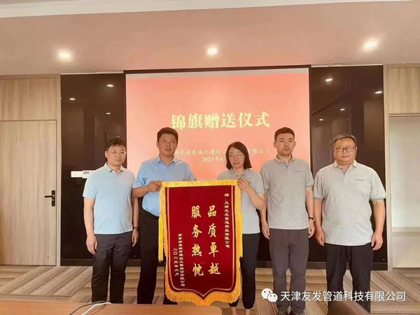 2023年6月,南京清泉城市建設(shè)工程股份有限公司送予天津友發(fā)管道科技有限公司“品質(zhì)卓越 服務(wù)熱忱”的錦旗,對(duì)我公司產(chǎn)品質(zhì)量及售后服務(wù)表示認(rèn)可和感謝。