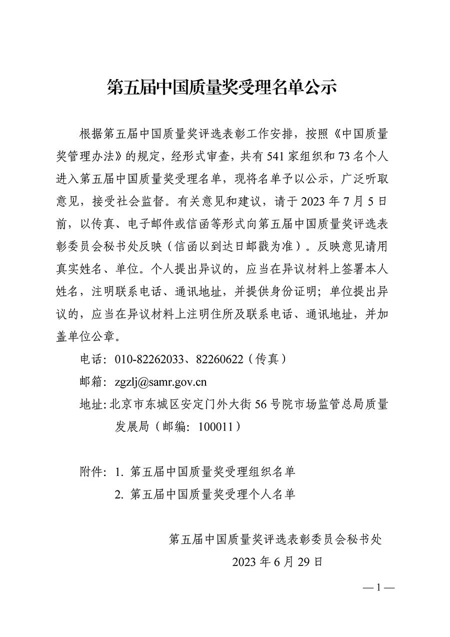 據(jù)悉,有關(guān)意見和建議可于 2023 年 7 月 5 日前,以傳真、電子郵件或信函等形式向第五屆中國質(zhì)量獎評選表彰委員會秘書處反映(信函以到達日郵戳為準)。反映意見應當用真實姓名、單位。個人提出異議的,應當在異議材料上簽署本人姓名,注明聯(lián)系電話、通訊地址,并提供身份證明;單位提出異 議的,應當在異議材料上注明住所及聯(lián)系電話、通訊地址,并加蓋單位公章。
