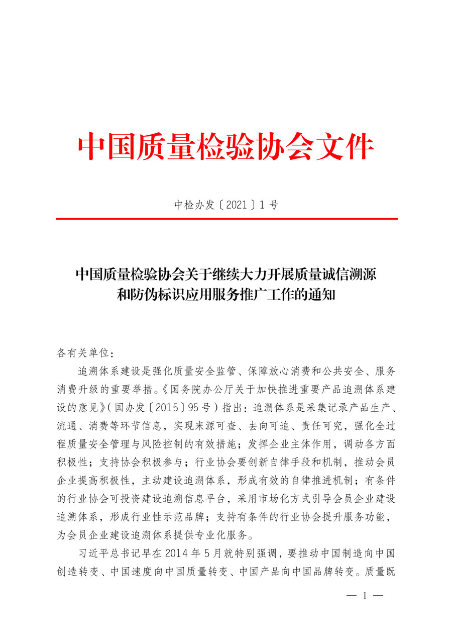 中國質(zhì)量檢驗協(xié)會關于繼續(xù)大力開展質(zhì)量誠信溯源