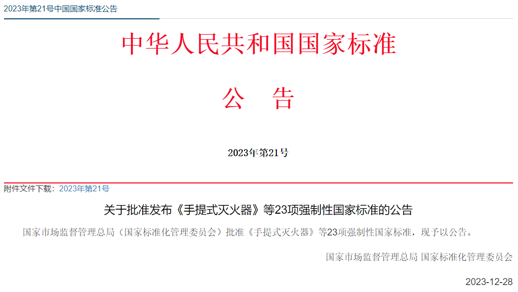 關(guān)于批準(zhǔn)發(fā)布《手提式滅火器》等23項(xiàng)強(qiáng)制性國家標(biāo)準(zhǔn)的公告