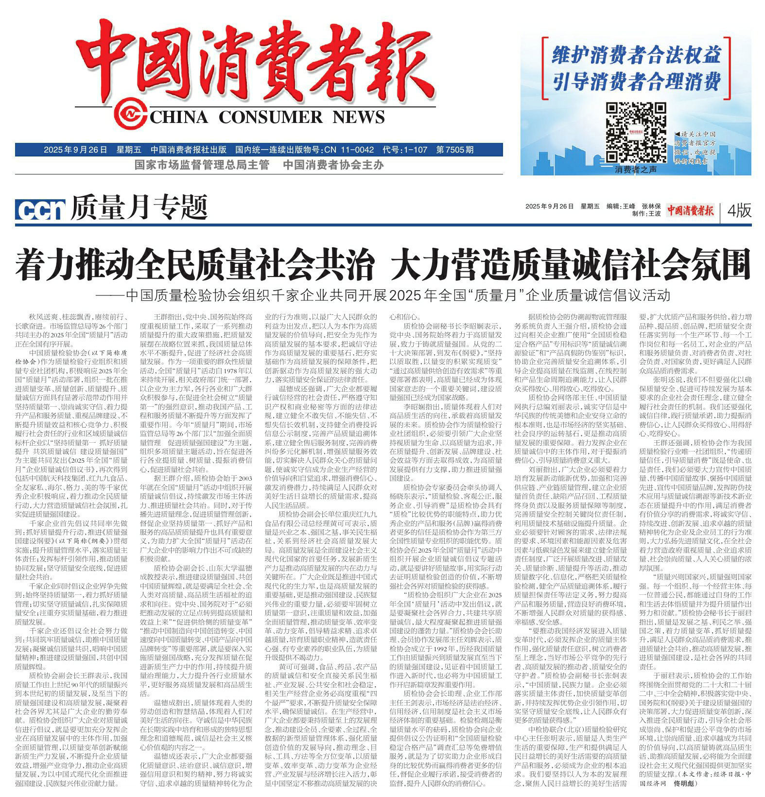 - 《中國質(zhì)量報》(2025年9月26日刊)發(fā)布:堅持質(zhì)量第一 抓好質(zhì)量提升 共筑質(zhì)量誠信 建設(shè)質(zhì)量強國——2025年全國“質(zhì)量月”企業(yè)質(zhì)量誠信倡議書(2025年9月·北京)